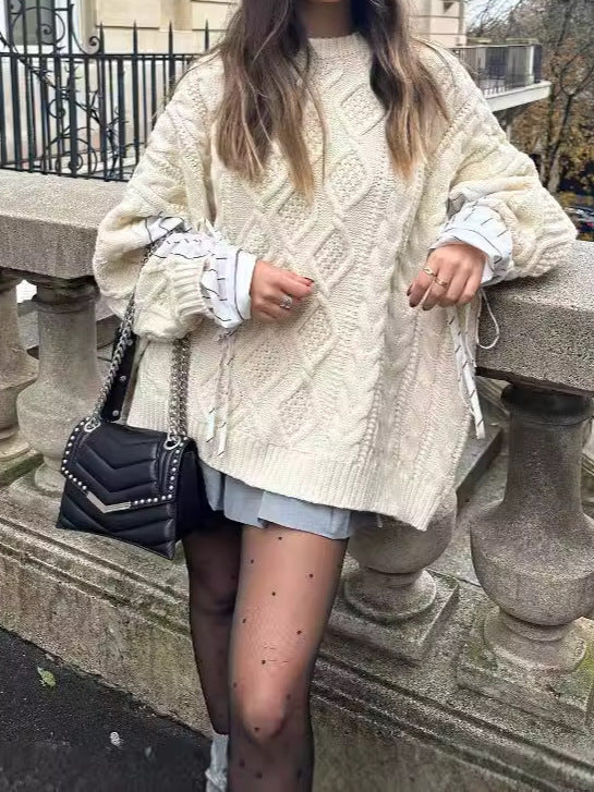 Achieve cozy and comfortable style with our Chunky Cable Twisted Knit Textured Sweater. This braided twisted knitted pullover boasts a chunky cable knit, ribbed neckline, and an elastic fitted design for ultimate comfort. Perfect for pairing with jeans, shorts, or skirts, this women's chunky knit sweater is both soft and stylish. Upgrade your wardrobe with our Combo Knit Pullover, featuring a spliced striped design on the sleeves, a ribbed knit material, an intentionally oversized fit, and a versatile two-way style that can be worn as a pullover or a dress.
